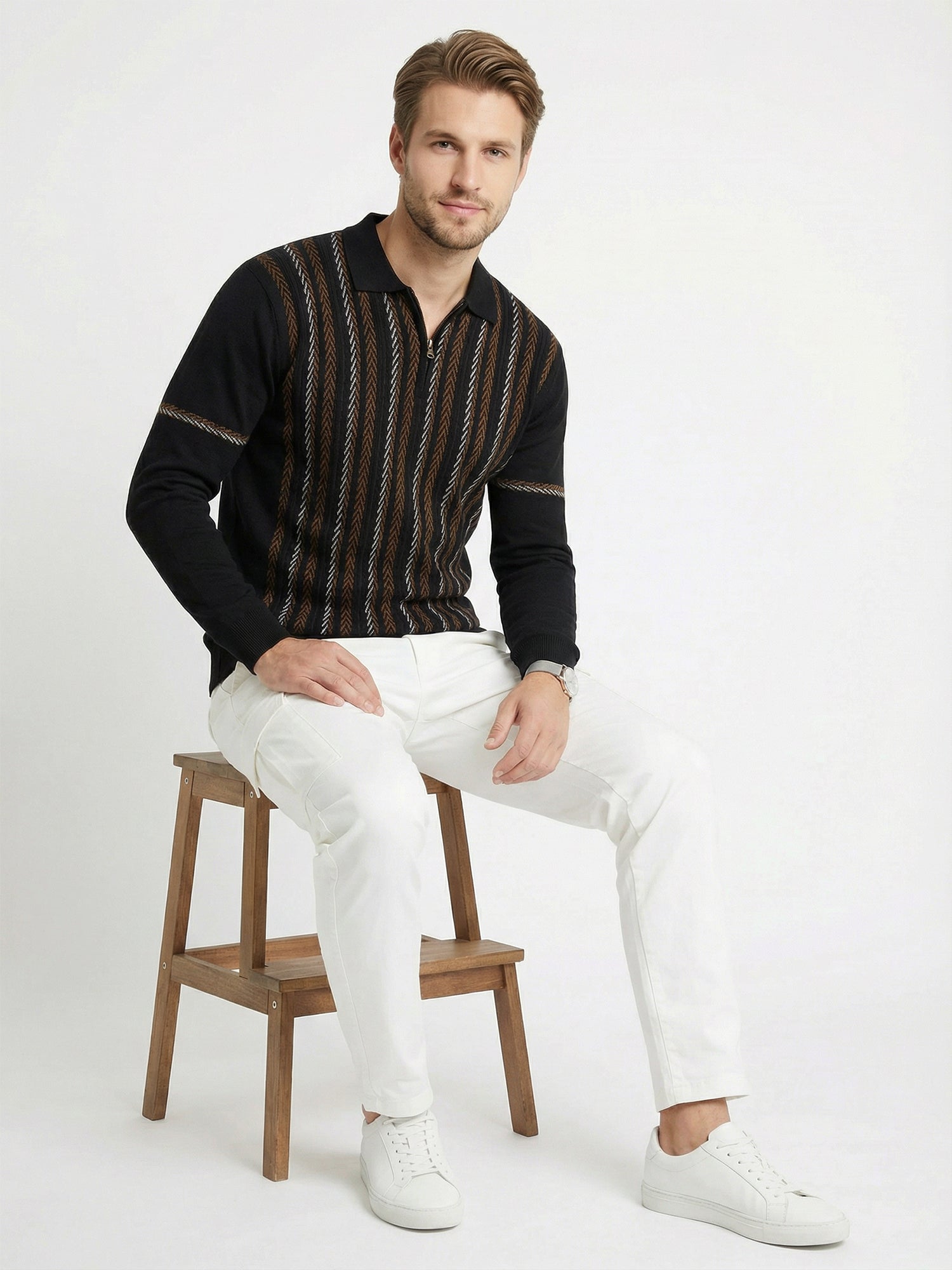 Cozy up in style with this striped textured sweatshirt that's ready for anything. Featuring bold black, brown, and white stripes with a tactile finish, it's the perfect layering piece for chilly days. The full sleeves keep you warm while the playful pattern adds personality to your everyday look. Whether you're heading out or staying in, this versatile sweatshirt pairs effortlessly with your favorite jeans or joggers for that effortlessly cool vibe.