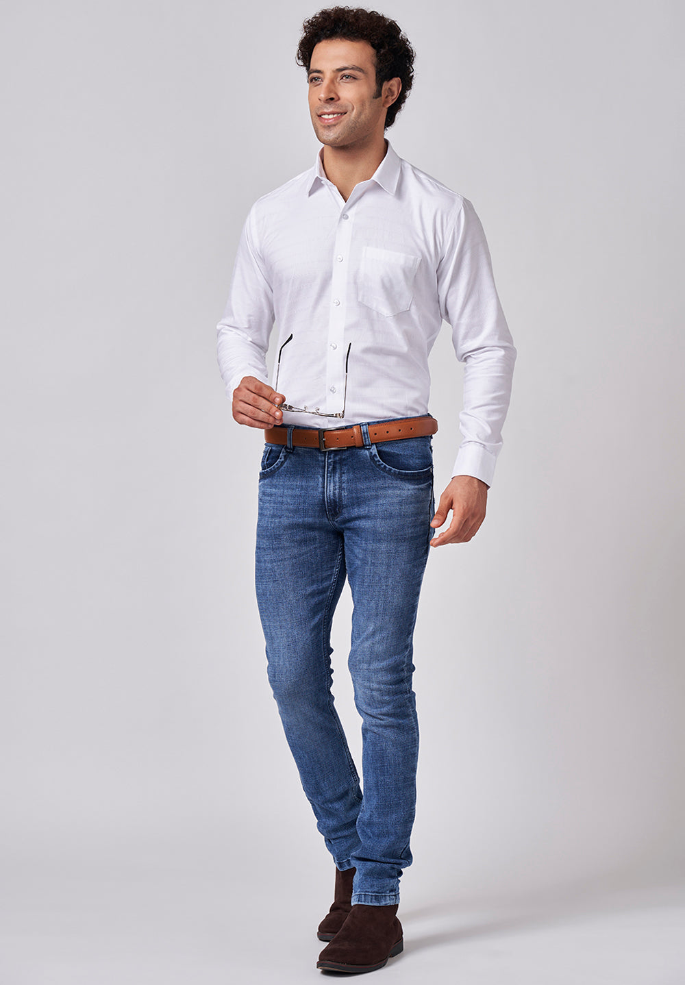Men White Slim Fit Formal Shirt Elevate your professional wardrobe with this crisp white formal shirt, expertly tailored in a slim fit silhouette. The classic striped pattern adds subtle sophistication while maintaining versatility for any business setting. Crafted for the modern professional, this shirt delivers a polished appearance with a contemporary cut that flatters without compromising comfort. Perfect for boardroom meetings, client presentations, or formal occasions where precision and style matter.